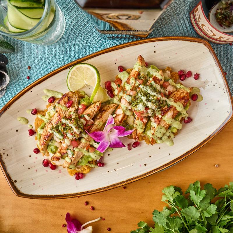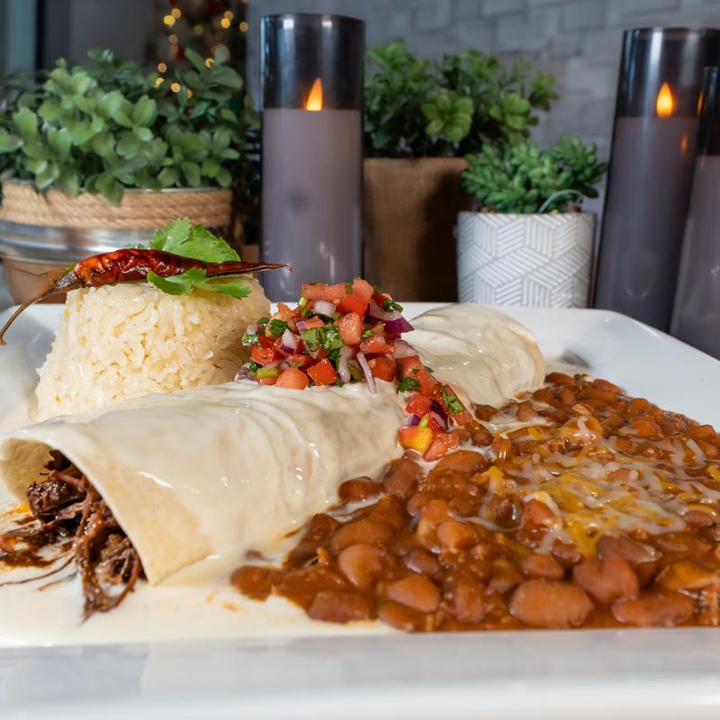 Served with charro beans or black beans and rice. Topped with pico de gallo and cheese dip.